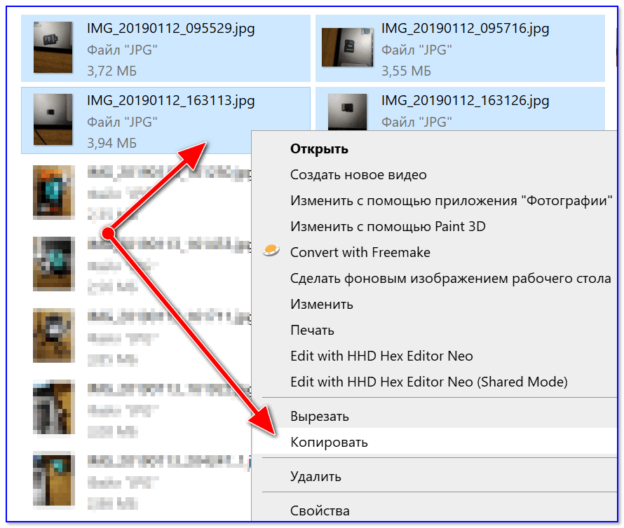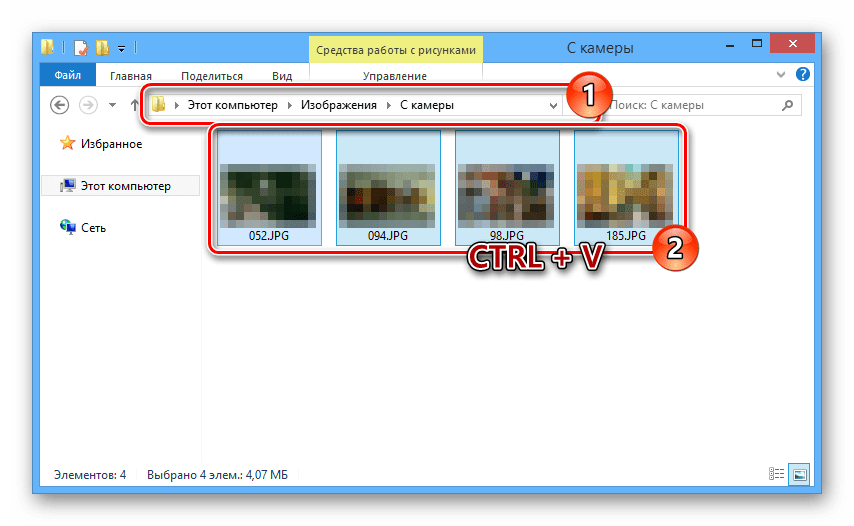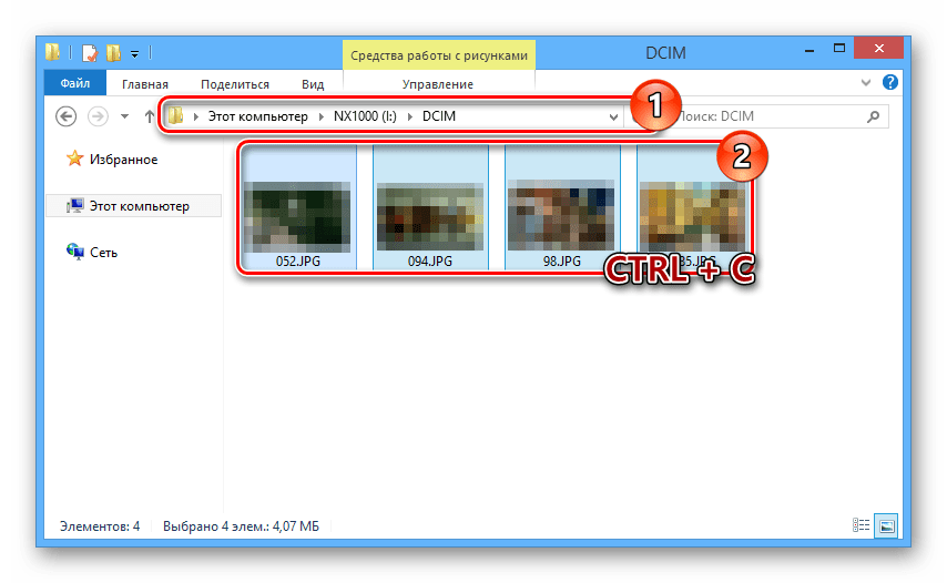 Затем, зажав левую кнопку мышки, выделяем файлы на фотокамере. Нажимаем Ctrl+С. Далее, открываем папку, куда мы хоим вставить фото и нажимаем Ctrl+V.