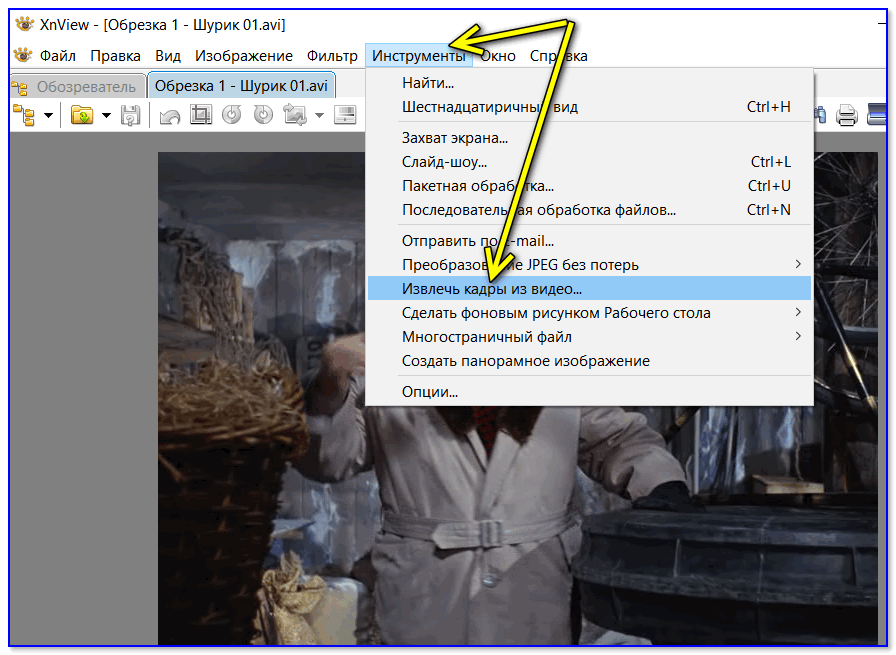 2) Далее переходим во вкладку «Инструменты / Извлечь кадры из видео».