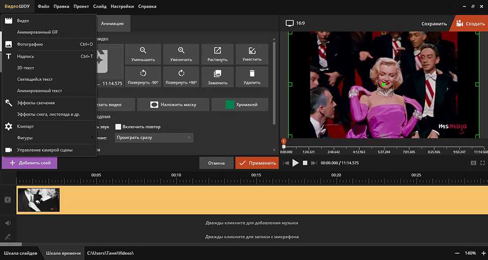 Среди основных особенностей приложения — множество инструментов и режимов для гибкого редактирования видео, качественных фотографии в высоком разрешении, большая коллекция интересных эффектов переходов, титров, фильтров, настраиваемые горячие клавиши. Здесь можно сделать слайд-шоу или клип хорошего качества буквально за несколько минут. В правой части главного окна приложения находится экран предпросмотра, внизу – шкала времени. Чуть выше нее – главная панель инструментов с меню.