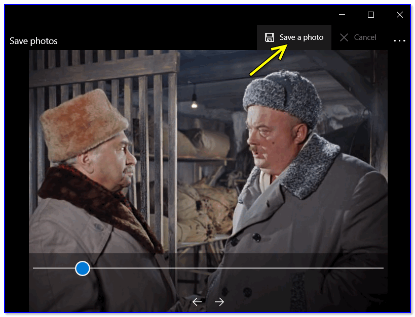 Далее автоматически откроется приложение «Фотографии» (тоже встроено в Windows 10). Выбираете нужный вам кадр, и нажимаете на значок «Дискеты» (Save Photo) — ву-а-ля и кадр сохранен! Удобно?!