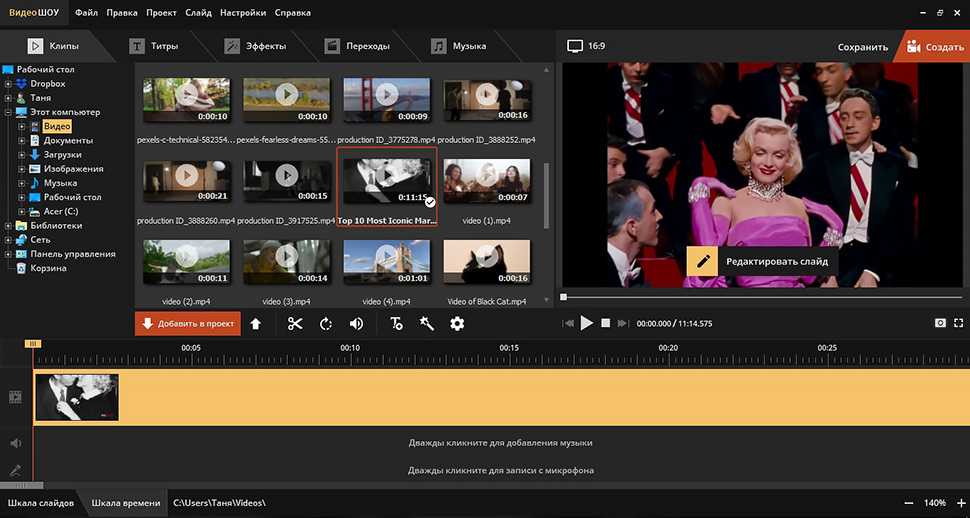 В левой боковой колонке видеоредактора найдите в списке папок директорию с нужным роликом. Выделите ее и перетащите клип из окна превью на временную шкалу.