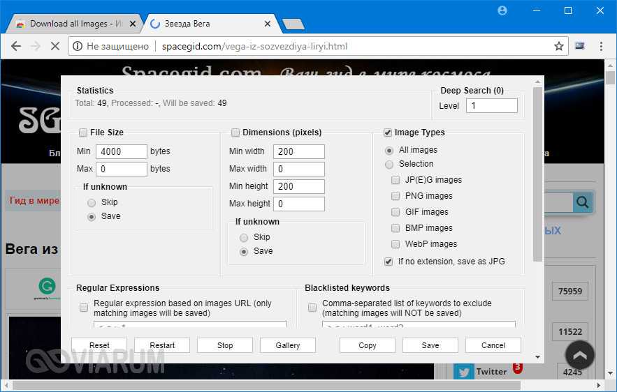 Установленное расширение создает традиционный ярлык на панели инструментов браузера, клик по которому вызывает окно с настройками сканирования веб-страницы. В настройках вы можете указать максимальный и минимальный размер и вес изображений, выбрать формат, указать, нужно ли загружать файлы с неопределяемым размером и присваивать файлам неизвестного типа расширение JPG. Для фильтрации контента по имени предусмотрена возможность использования регулярных выражений и «черного» списка, в который автоматически станут заноситься файлы с указанными вами ключевыми словами в названиях.