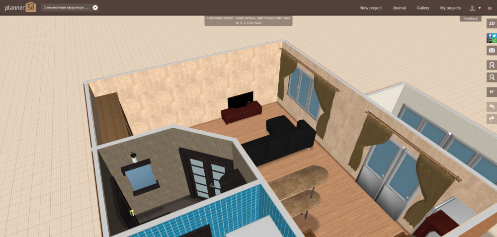 Чтобы оценить свой интерьер в 3D, как будто вы находитесь в нем виртуально, ухватитесь мышкой за иконку человечка и переместите в нужном месте квартиры. В режиме «из глаз» перемещаться можно клавишами WSAD клавиатуры, а вертеть головой при помощи мыши.