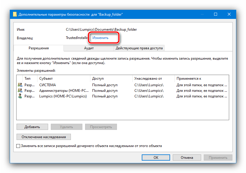 В новом окошке кликните ссылочку «Изменить», расположенную в строчке «Владелец»;