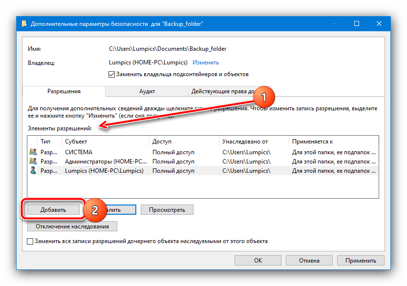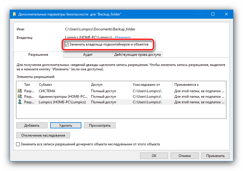 - Если вы меняете владельца папки, то в окне «Дополнительные параметры безопасности» появится пункт «Заменить владельца подконтейнеров и объектов», отметьте его.