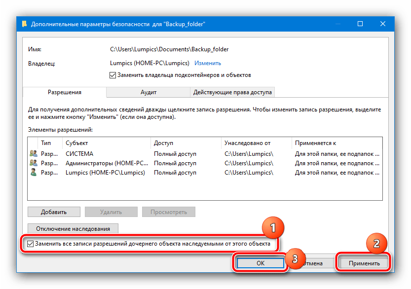Вернувшись в окно «Дополнительные параметры безопасности» отметьте так же пункт «Заменить все записи разрешений дочернего объекта наследуемыми от этого объекта». Нажмите «Ок».