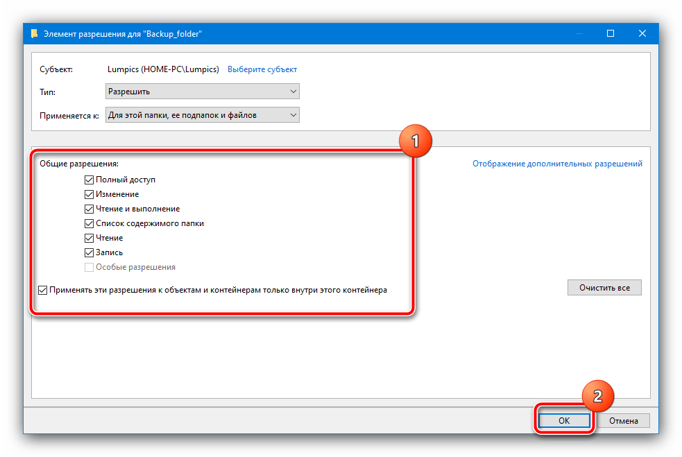 В следующем окне нажмите «Выберите субъект» и найдите свое имя пользователя так же, как на первом этапе в 4-м пункте. Установите полные права доступа для этого пользователя и нажмите «Ок».
