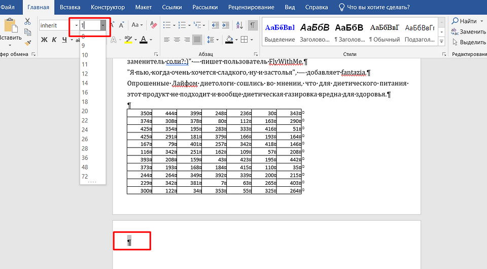 Если страница заканчивается таблица, то после нее останется лист, который сложно удалить. Дело в том, что после таблицы всегда есть пустой абзац, который нельзя выделить и убрать с помощью клавиши «Delete». Есть способ, который позволит убрать пустую страницу даже после таблицы. Выделите пустой абзац двойным нажатием левой кнопки мыши. В разделе «Шрифт» на вкладке «Главная» вручную введите значение размера – «1» без кавычек.