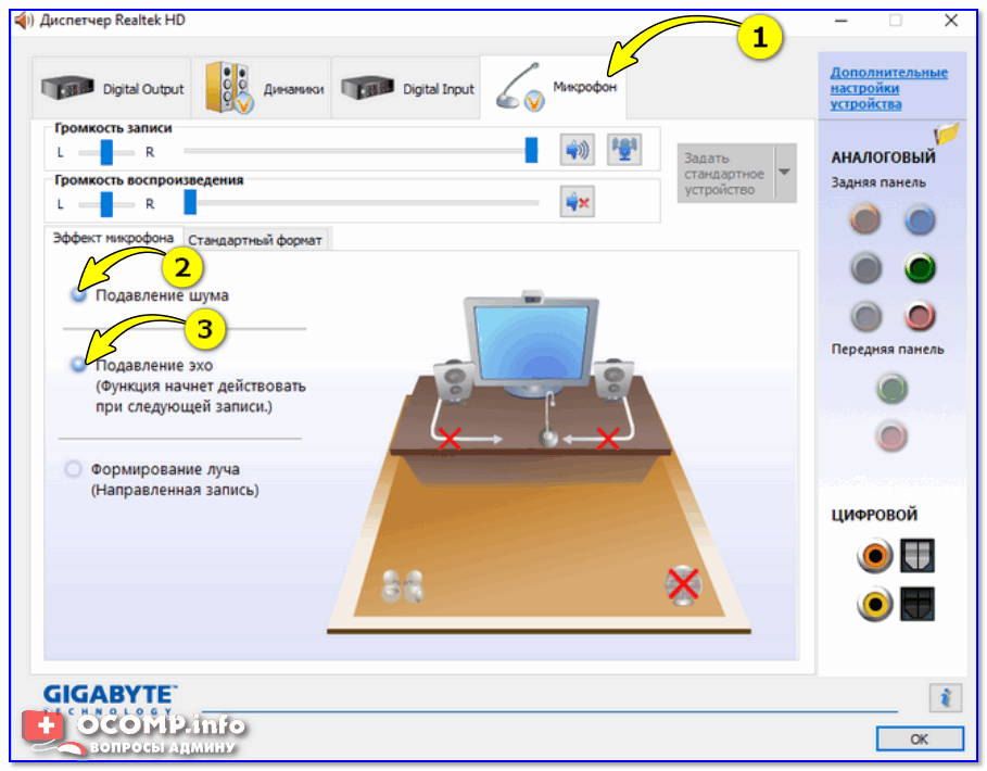 В диспетчере управления звуком — имеется раздел с параметрами микрофона: в нём есть настройки громкости, чувствительности, фильтры эха, шумоподавления и т.д.