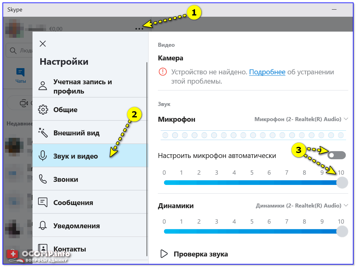 Например, в Skype для этого достаточно кликнуть по «трём точкам» в верхней части окна . А после в разделе «Звук и видео» отключить автоматическую подстройку микрофона и вручную установить ползунок. Пример ниже.