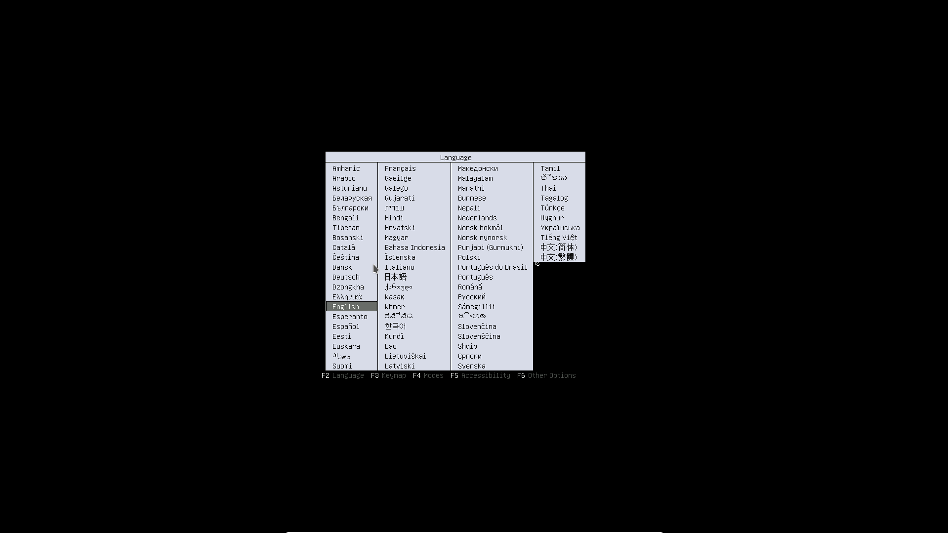 На первом шаге, как и в Ubuntu нам предстоит выбрать язык установщика. Нажмите любую клавишу и выберите с помощью стрелок на клавиатуре русский: