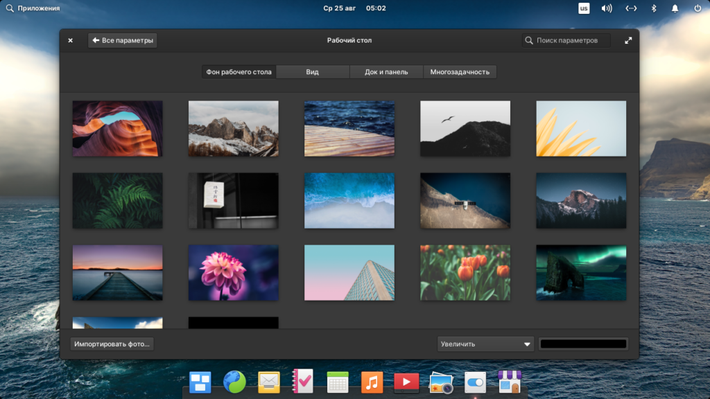 Elementary OS имеет не так много настроек внешнего вида. Вы можете сменить обои рабочего стола в разделе настроек Рабочий стол в вкладке Фон рабочего стола.