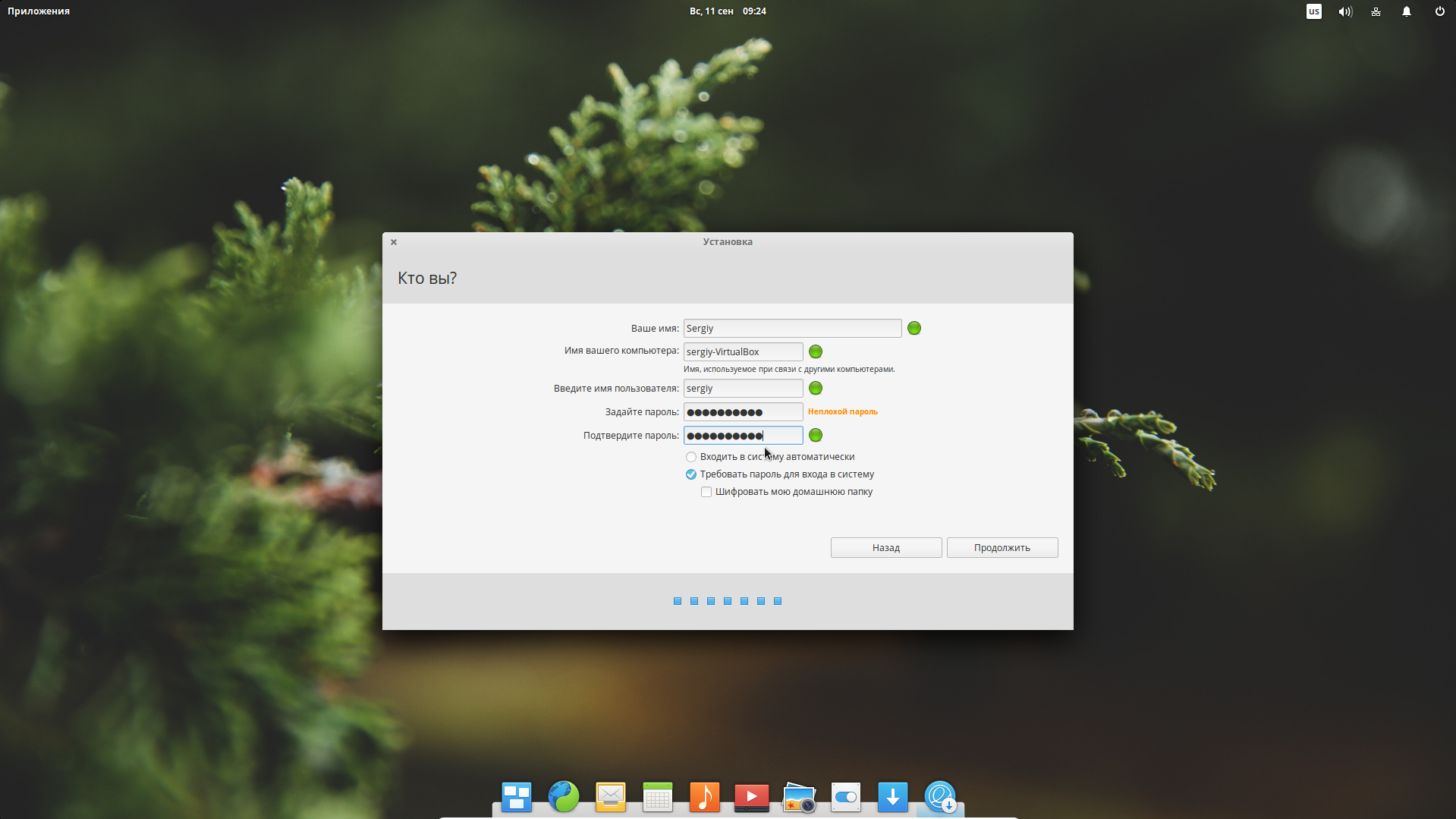 Здесь нужно указать логин и пароль. На первое время, пока нужно настроить систему, лучше выбрать простой пароль — система будет часто запрашивать его при установке программ.