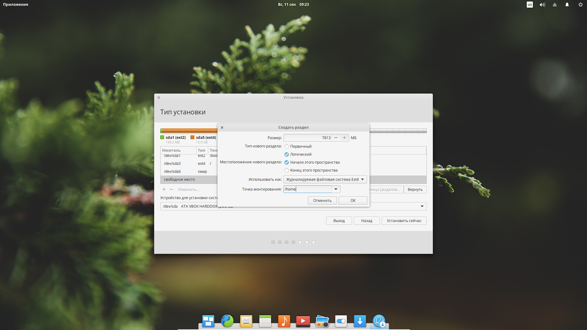 Наконец, выделите все оставшееся пространство разделу / home, выберите«Логический раздел» (первичный раздел заполнен)、«Начальная позиция космоса», «Ext4» и«Точка крепления / дом