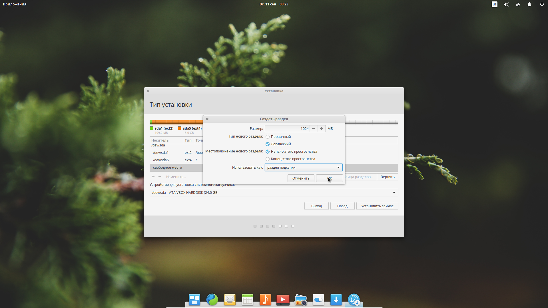 Во время установки выберите опцию «Другое» и выберите ранее созданный раздел «Elementary» для установки. Также выберите опцию для установки загрузчика GRUB на тот же раздел. Установка должна занять несколько минут.