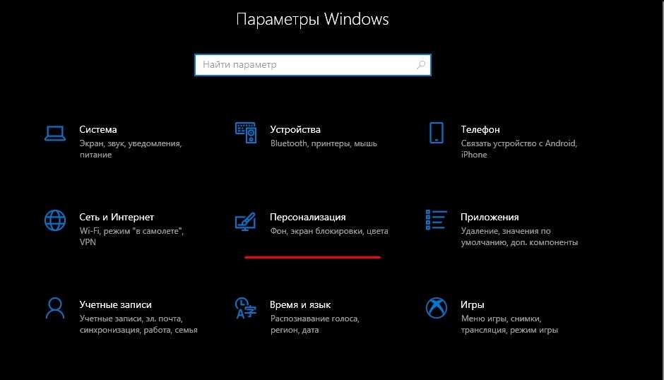 Основная часть кастомизации главного экрана заключается в изменении его оформления. Чтобы перейти к настройкам внешнего вида Рабочего стола откройте «Параметры», а затем – раздел «Персонализация». Здесь вы увидите несколько пунктов, каждый из которых отвечает за определенный вид настроек:
