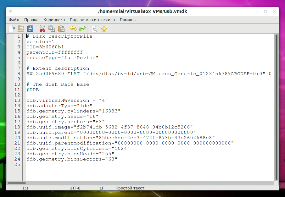 Обратите внимание, что файл usb.vmdk — это просто текстовый файл, который вы можете переместить в любое место и даже отредактировать.