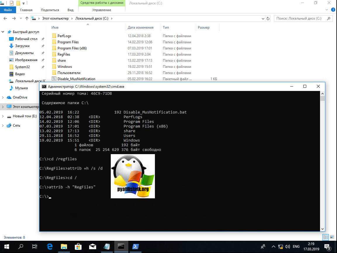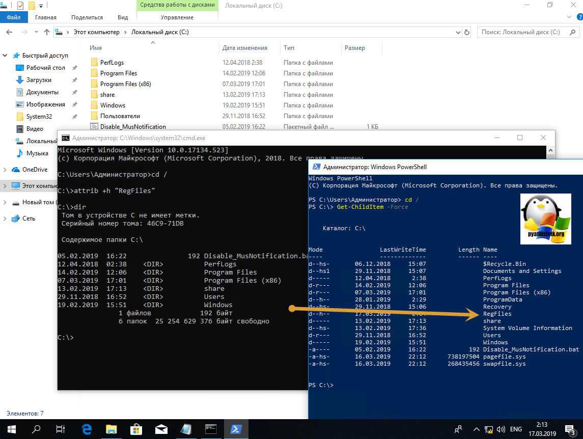 То же самое можно выполнить и из командной строки. Предположим, что я хочу сделать папку C:RegFiles скрытой. Для этого находясь в командной строке, желательно открытой от имени администратора, перейти в нужный каталог, где содержится нужный объект, напоминаю, что моя папка лежит в корне диска C: