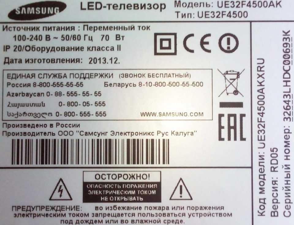 Независимо от производителя, на задней панели ТВ есть заводская наклейка. На ней указаны все сведения о модели: наименование, тип, версия, источник питания, страна и дата производства, а также другие важные данные.