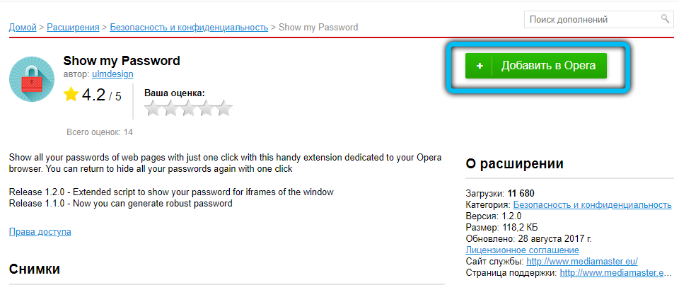 Для этого обозревателя существует расширение ShowPassword. Оно имеет открытый исходный код, а значит никаких вирусов и прочей нечистой ереси вы там не найдете. Устанавливаем расширение и пробуем его в действии.