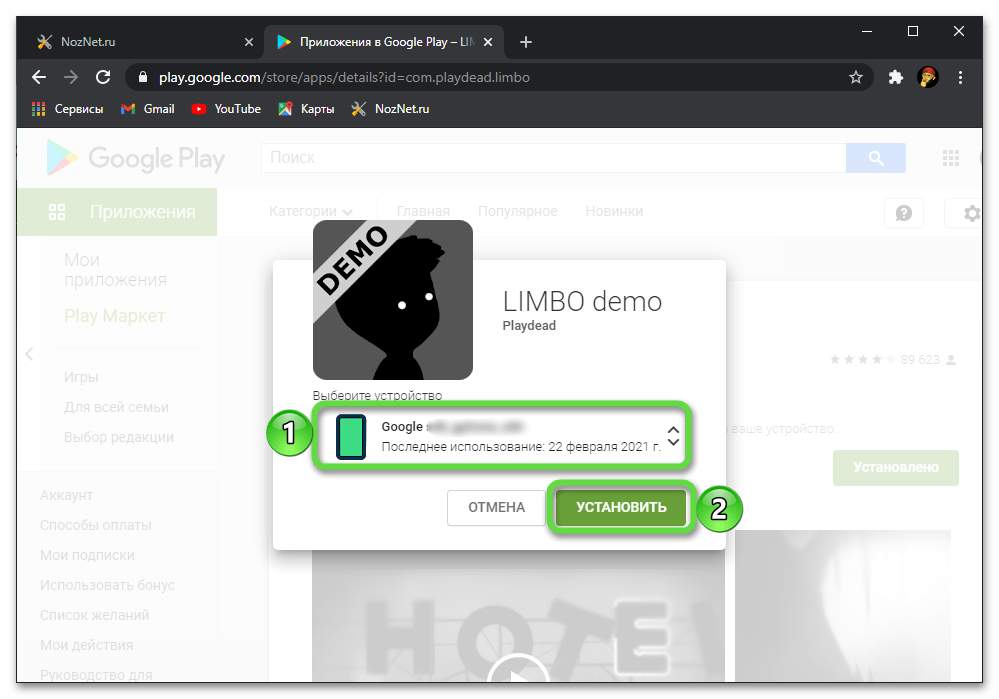 - Далее кликаете по вкладке «Установлено» и в отдельном окошке кликаете по кнопке «Установить», предварительно выбрав устройство, куда именно будет произведена инсталляция данного приложения.