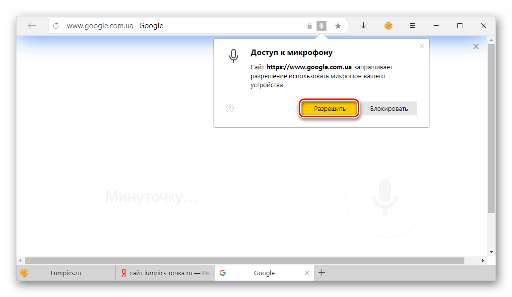 Во всплывающем окне, если оно появится, предоставьте браузеру разрешение на использование микрофона, переведя соответствующий переключатель в активное положение.