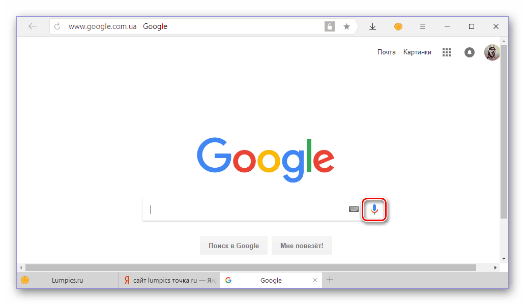 - Перейдите на главную страницу Google и нажмите по иконке микрофона в конце поисковой строки.