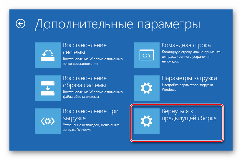 Далее в списке находим кнопку «Вернуться к предыдущей сборке» и нажимаем на нее.