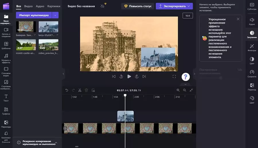 Clipchamp Create — продвинутый редактор видео, работающий в режиме онлайн. В нем есть все необходимые опции для того, чтобы быстро и правильно наложить картинку на видео, но и без ограничений не обходится. В бесплатной версии сайта можно скачать готовый проект только в 480p и с наложенным водяным знаком.