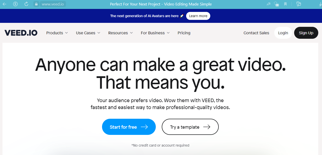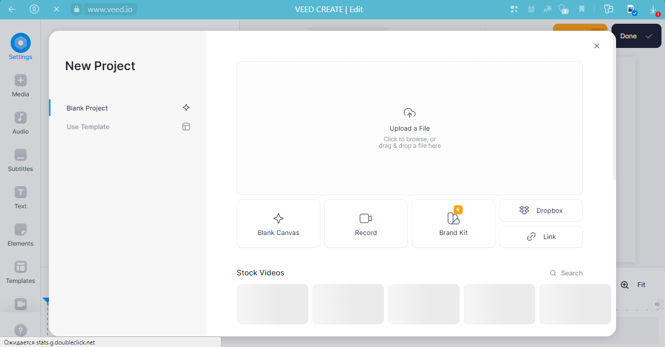 Откройте Veed.io в любом из удобных браузеров и кликните на создание видео. Также можно использовать предустановленные шаблоны, но нас интересует первый вариант.