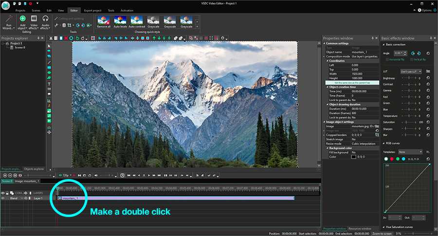 Если вы хотите, чтобы сквозь снимок просвечивало видео, настройте «Прозрачность». Выделите картинку, если хотите изменить ее размер. Регулируйте масштаб графического элемента, растягивая или сжимая его при помощи мышки.