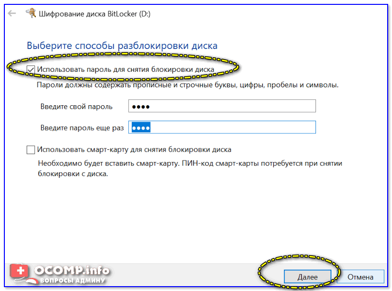 После указываем, что нам необходимо зашифровать диск и установить пароль (для снятия блокировки). Пример ниже