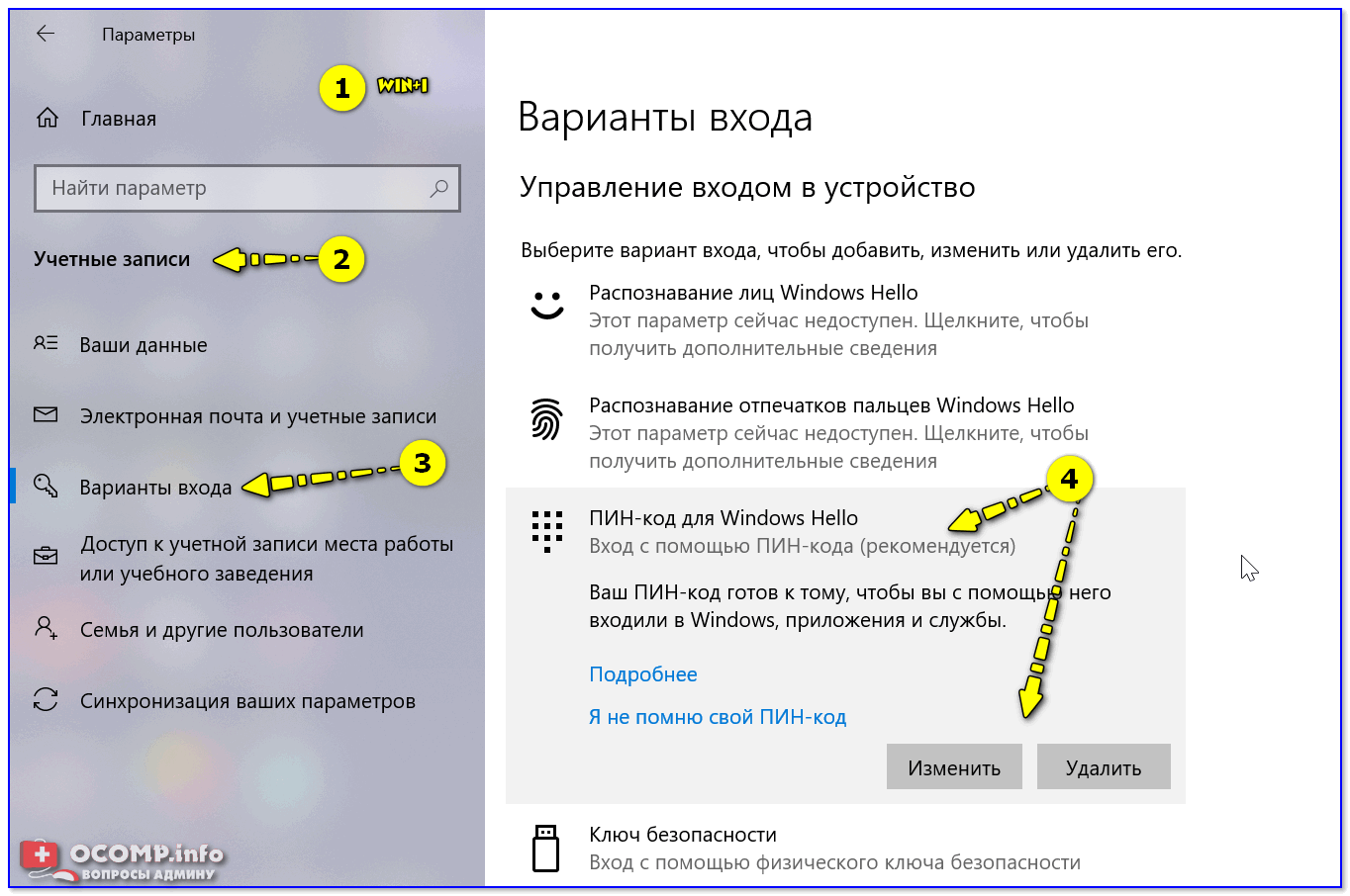 Как установить ПИН-код (пароль) в Windows 10 : нажать Win+i, в параметрах открыть вкладку «Учетные записи / варианты входа» и кликнуть по меню «ПИН-код» .