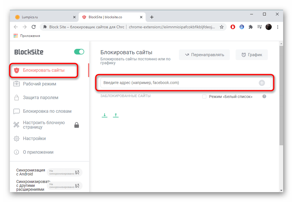 Менее популярный вариант — применение браузерных расширений. У этого способа есть свой минус, который связан с тем, что URL будет блокироваться исключительно в том веб-обозревателе, куда было установлено дополнение. То есть пользователю ничего не помешает открыть другой браузер и там уже спокойно перейти на необходимый веб-ресурс. Однако если вас устраивает данный вариант, выполните следующие действия.