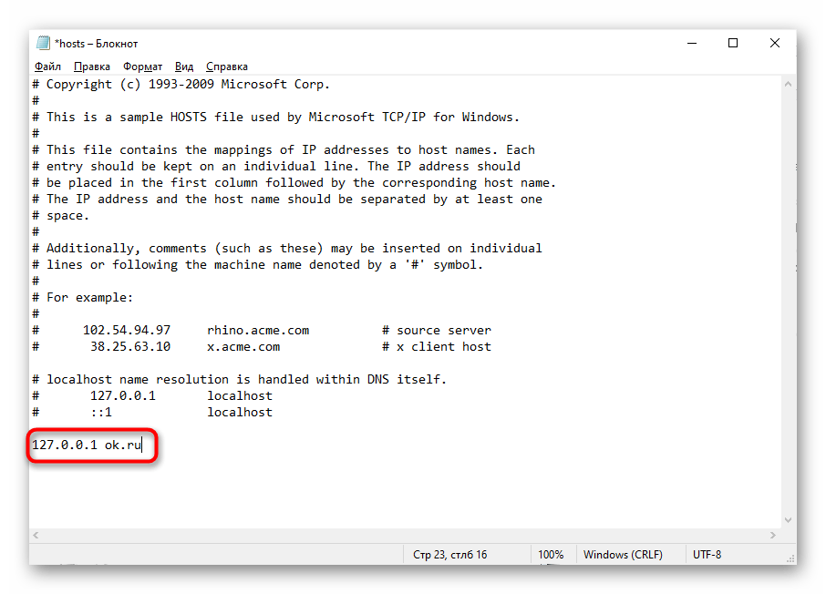 - В следующую строку скопируйте указанный здесь IP, приписав к нему справа адрес сайта, который необходимо заблокировать.