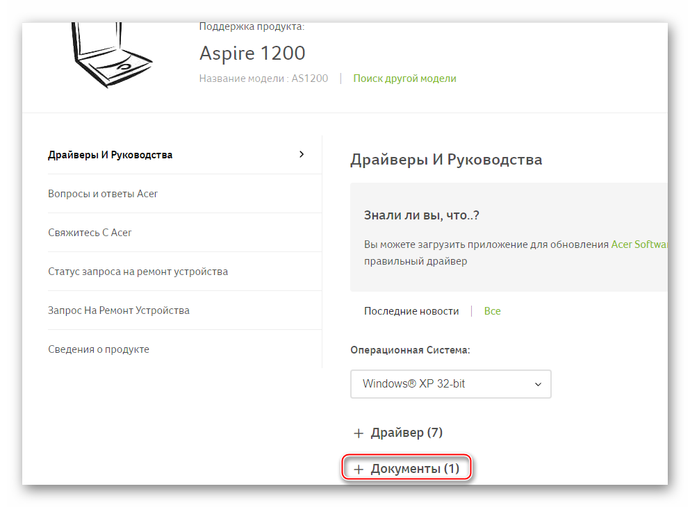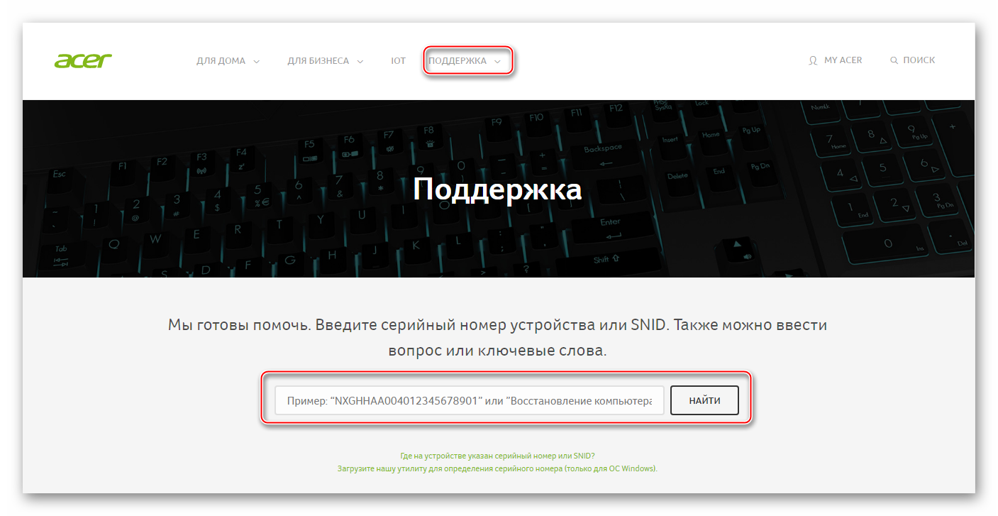 - Перейдите на сайте https://www.acer.com на страницу вашей модели ноутбука по аналогии с тем, как это было описано в разделе «Как определить клавишу входа в BIOS» данной статьи.