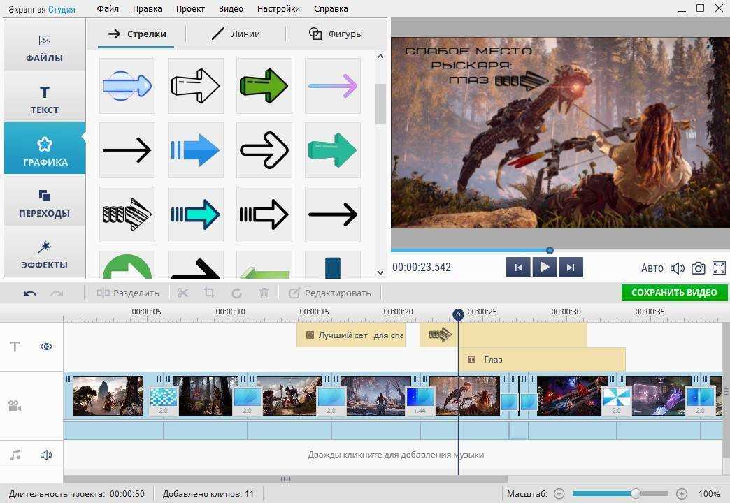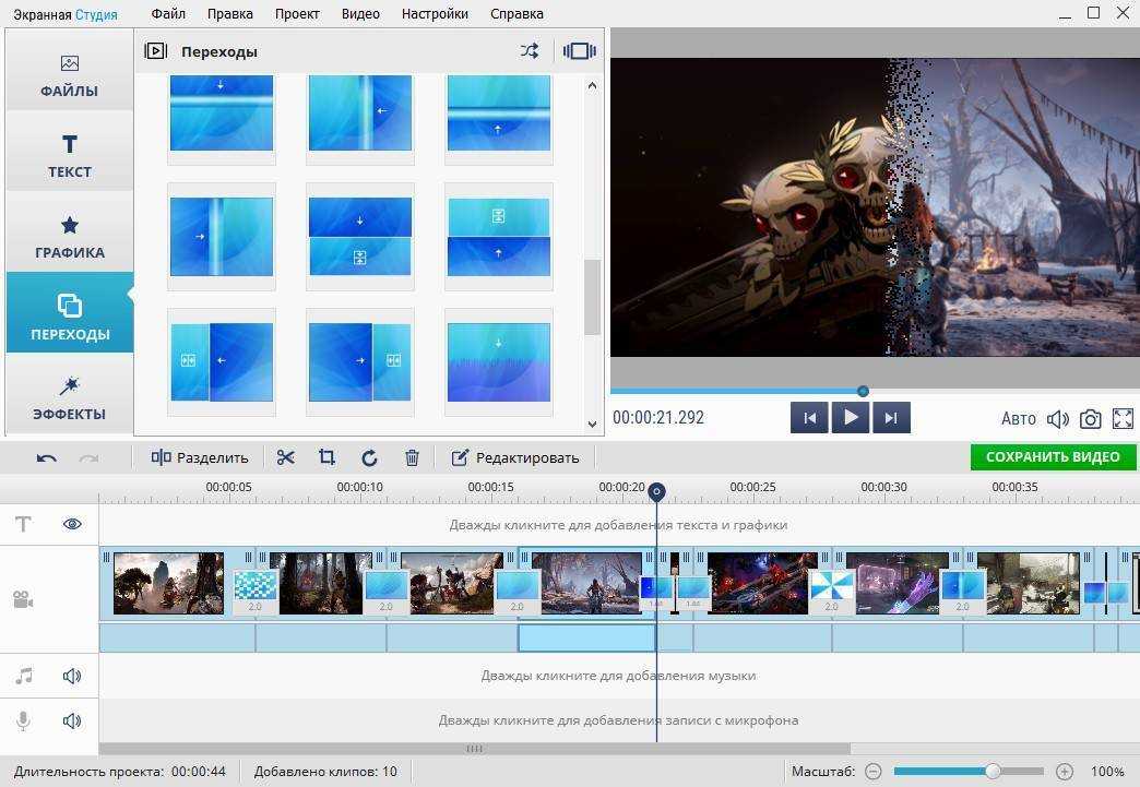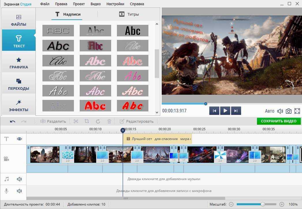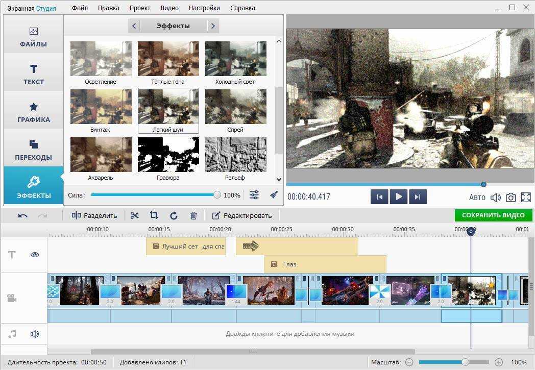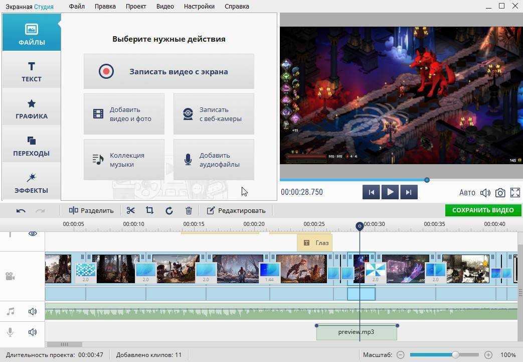 Чтобы записывать игру с экрана, воспользуйтесь программой Экранная Студия. С ее помощью можно захватить любое действие на мониторе со звуком, снять материал с веб-камеры, добавить клипы с компьютера и произвести видеомонтаж. Приложение предлагает все необходимые инструменты для оформления видеоуроков, курсов, летсплеев, влогов и других роликов. Софт может работать на ноутбуке и слабом ПК.