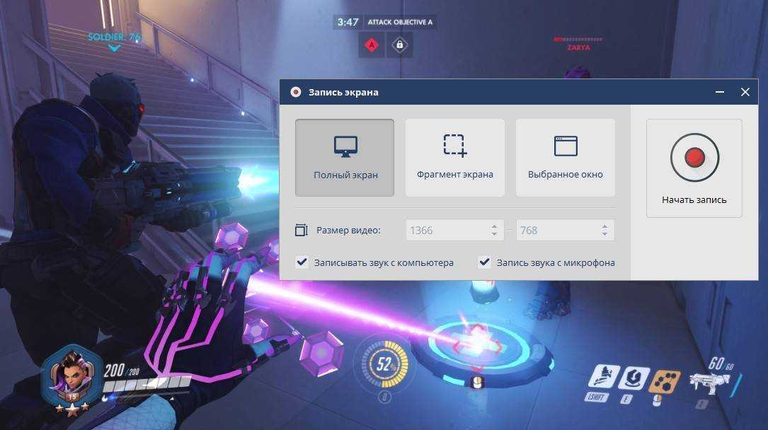 В новом окне установите подходящие параметры: вы можете снимать весь экран, указанный фрагмент или выбранное окно. Также можно скорректировать размер рамки вручную, указать источник звука и микрофон. Затем начните видеозахват, кликнув на соответствующую кнопку. Приложение не имеет ограничений по времени записи и производит видеосъемку без потери FPS.