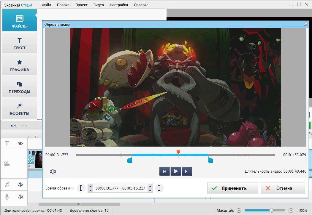 Чтобы поставить процесс на паузу, нажмите на клавишу F8, а для его остановки — F10. Видеозапись будет автоматически загружена во встроенный видеоредактор.