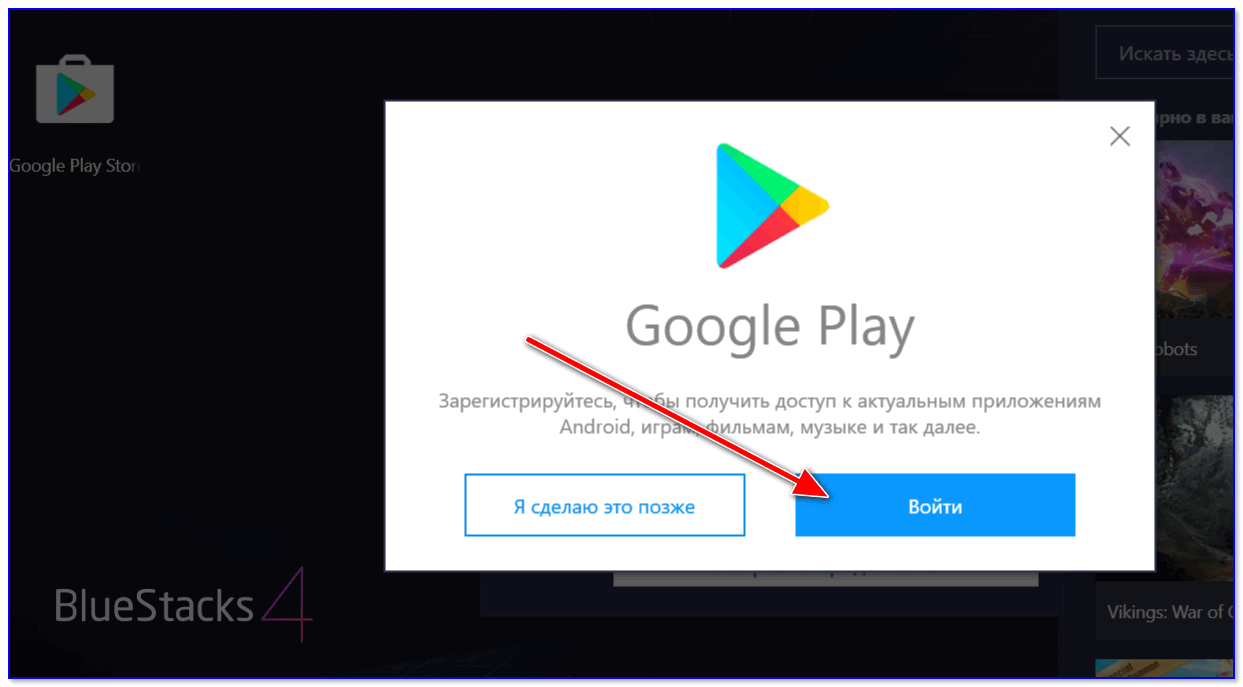 После установки и запуска BlueStacks — он при первом запуске предложит войти в аккаунт Google Play. Рекомендую так и сделать (нужно будет ввести свой телефон/почту и пароль). В общем-то, здесь без комментариев.