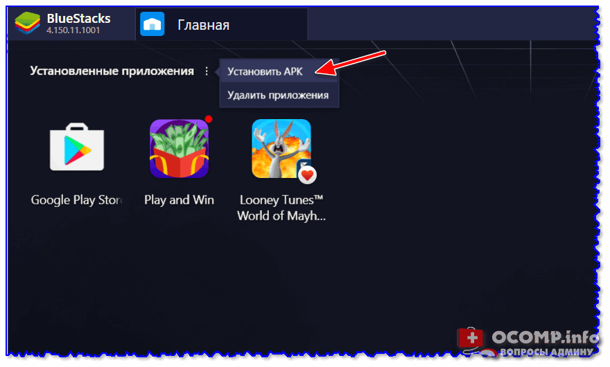 Впрочем, нельзя не отметить, что BlueStacks позволяет устанавливать игры и из APK файлов (см. скрин ниже). Правда, через Google Play все же удобнее и безопаснее.