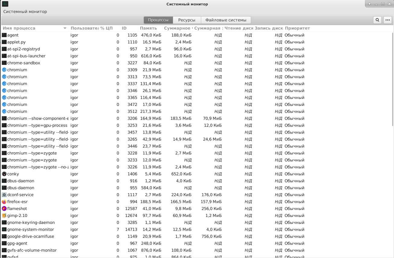 Системный монитор Gnome содержит три вкладки: Процесс, Ресурсы и Файловые системы.