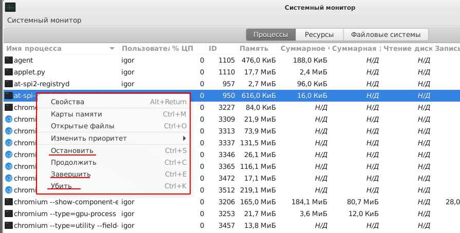 Если выбрать нужный вам процесс и кликнуть по нему правой кнопкой мыши, откроется меню действий над процессом.