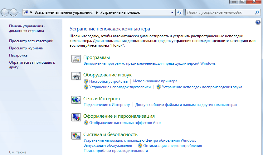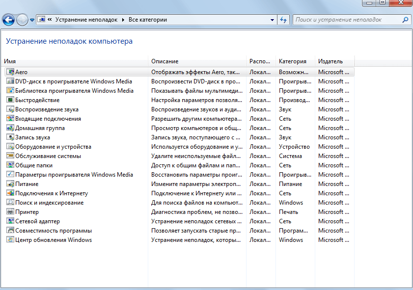 Главное окно мастера устранения неполадок представляет собой список категорий, нажатие на которые запускает средство отладки для конкретного элемента системы. Здесь собраны: