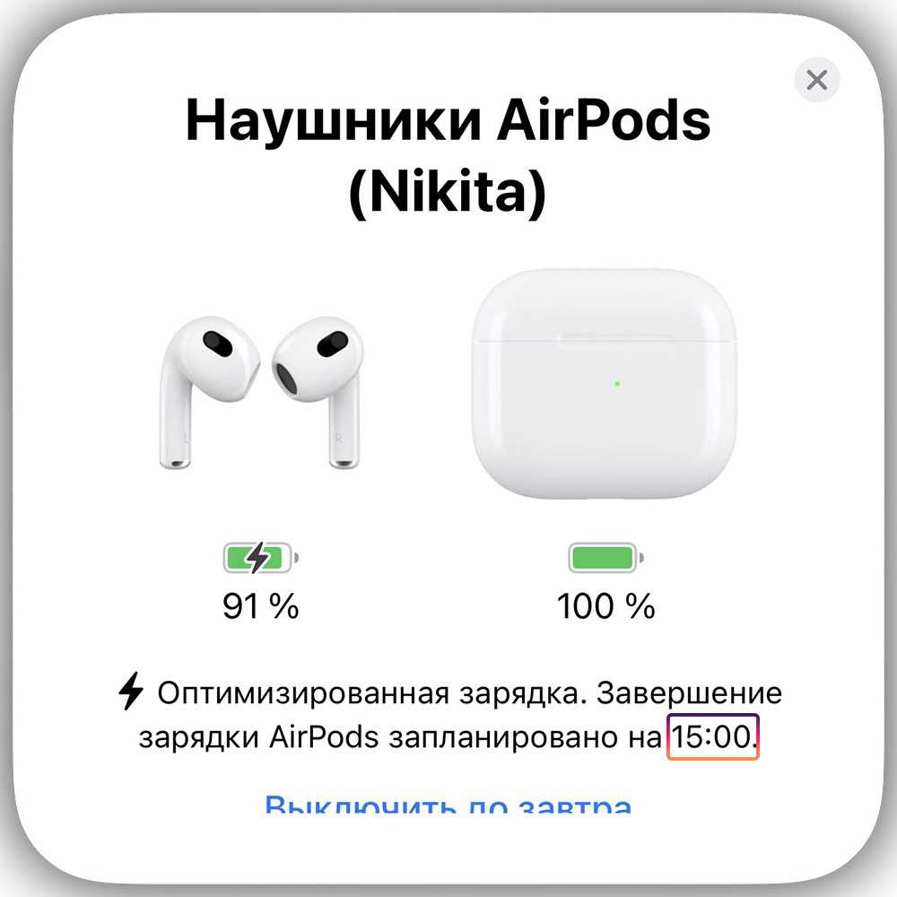 По мнению AirPods и iOS 15, мои наушники надо заряжать полностью только к 15:00. В такое время я почти никогда не бываю дома, а сами наушники лежат в кейсе, что ношу с собой. От чего они должны к этому моменту «зарядиться», я понятия не имею. Думаю, что Apple тоже не в курсе, иначе бы и проблемы такой не было.