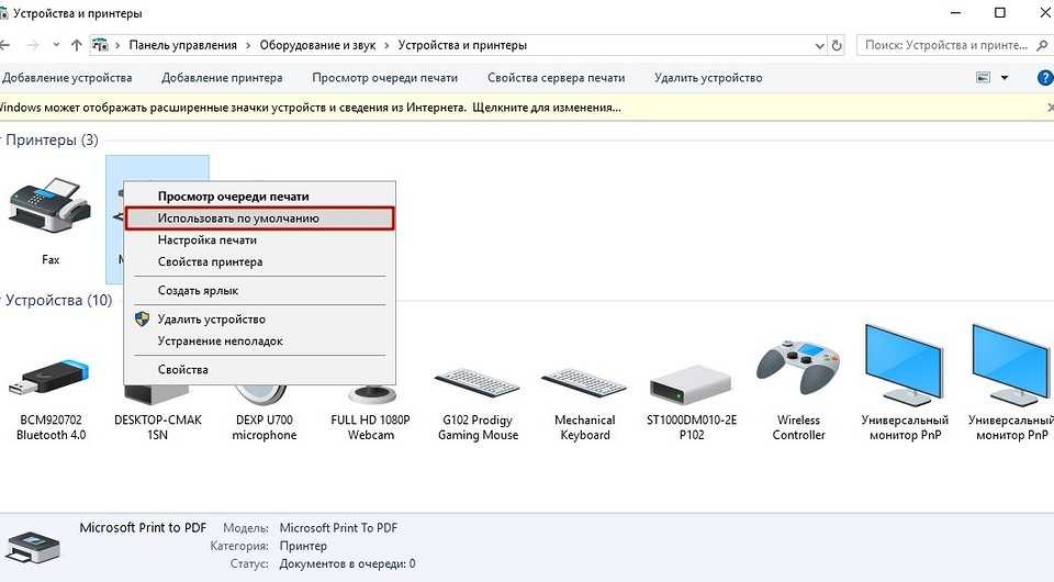 Еще одна распространенная причина, почему ноутбук не находит принтер — неправильно выбранное устройство в средствах для печати. По умолчанию должен быть выбран принтер, на котором вы хотите выполнить печать. Это нужно для того, чтобы задания в автоматическом режиме отправлялись на устройство, которое в приоритете стоит выше остальных. Сделать это очень просто.