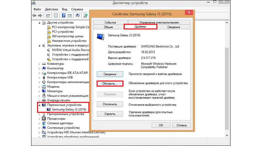 - Кликнуть правой клавишей мыши по смартфону и выбрать пункт «Обновить драйверы».
