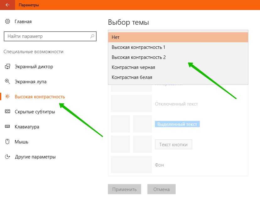 - во вкладке «Высокая контрастность» настроить подходящую тему.