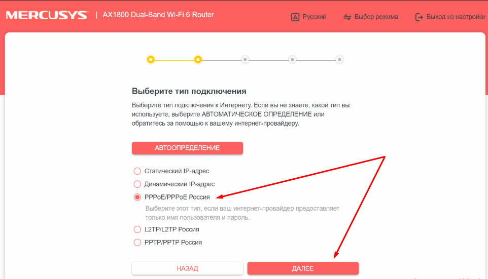 5. В пункте «Тип подключения» в выпадающем меню выберите пункт «PPPoE/PPPoE Россия» и нажимаем кнопку Далее.