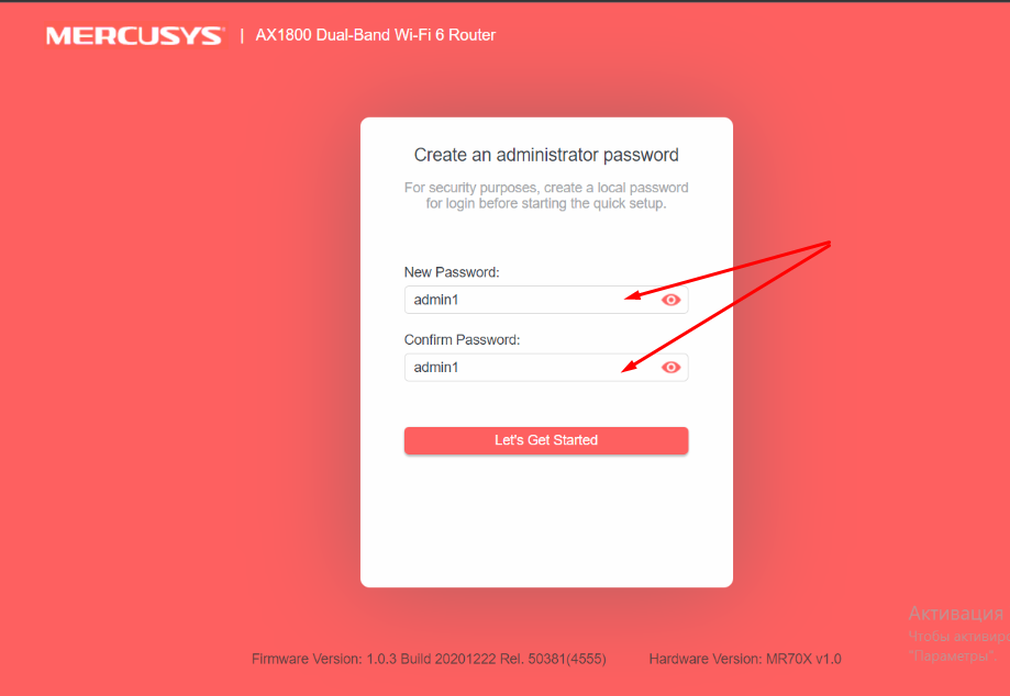 3. Нужно ввести пароль для доступа к настройкам роутера. В качестве пароля введите admin1, в строке Confirm Password так же вводим admin1. Нажмите кнопку «Let’s Get Started». Если выдало ошибку неверный логин или пароль, то попробуйте пароль Admin1.